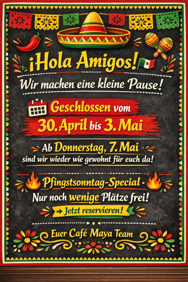 Nicht nur mexikanische Küche sondern auch Kleinigkeiten, Kuchen , Kaffee , Salat . Wer in der Stadt arbeitet und unterwegs ist, der kann bei uns eine kleine Pause zum Mittagessen einlegen oder sich gemütlich zum Kaffeekränzchen verabreden , abends mit Freunden und Familie lecker Essen gehen. Wir bieten für jedes Bedürfnis etwas.